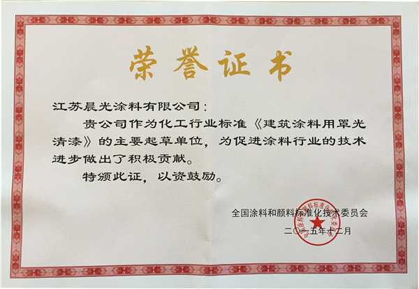 江苏壹号娱乐-com - NG大舞台,有梦你就来涂料在2015年中战绩喜人,作为《建筑涂料用罩光清漆》的主要起草单位,掌握着核心罩光漆研发技术,并因这一颇有含金量的科技实力,而成为化工行业罩光清漆标准制定的核心成员,被全国涂料和颜料标准化技术委员会授予“积极贡献奖”。